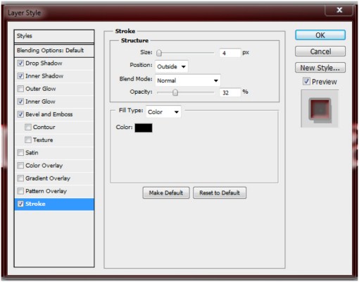 Lastly, apply a stroke style by checking the Stroke box. Try to follow the settings, but if you wish to experiment, you could try different settings to achieve your ideal effect, not only for this layer style but also with the other layer styles. You could even add some other styles and try some other options later on for other projects.