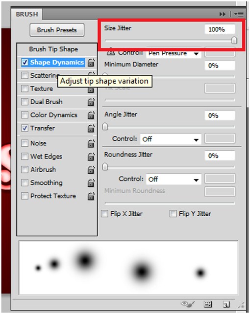 Enable the shape dynamics box. Set the size jitter to 100 percent