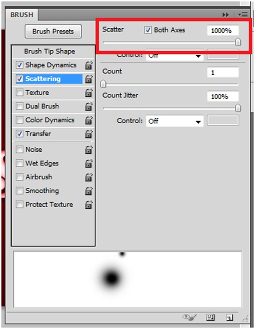 Enable the Scattering box, and then set the Scatter to 1000 percent. Also check the Both Axes box.