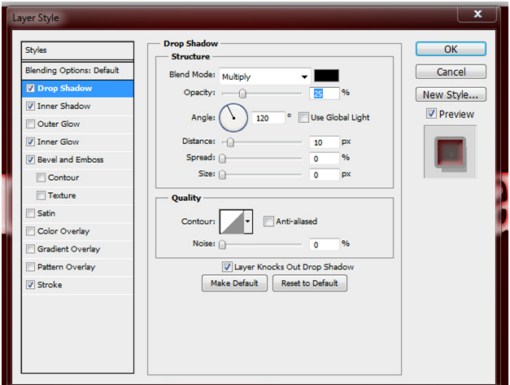 Here we want to check the Drop Shadow box, choose the solid black color, change the blend mode to multiply, set the opacity to 25%, change the angle to a 120 degrees, set the distance to 10 pixels, and leave the spread and size at zero.