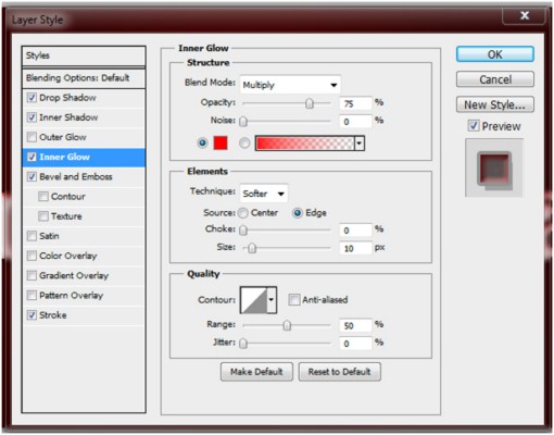 For the Inner Glow settings follow the parameters shown below. Be sure to check every single box and settings bar to achieve the effect for your text.