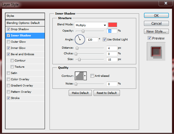 Next we need to add an Inner Shadow by checking its box. Set the following as instructed, blend mode to multiply, color is something close to pink or light red, opacity to approximately 25 percent, angle of 120 degrees, and set the Contour using the shape just like the one on the image below.