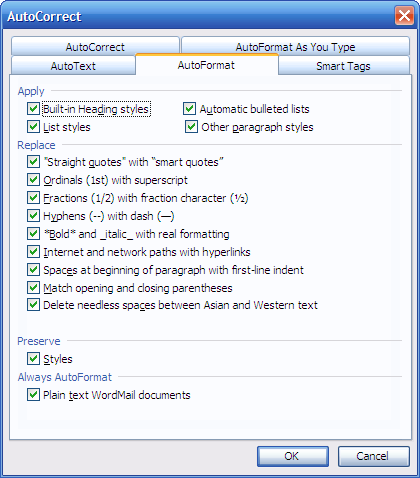 Select the “AutoFormat” tab and you’ll all the options that can be automatically applied. Once you selected all the changes you want to apply, close that window and hit “Alt+O+A”. Here’s a window that opens up once you do that: