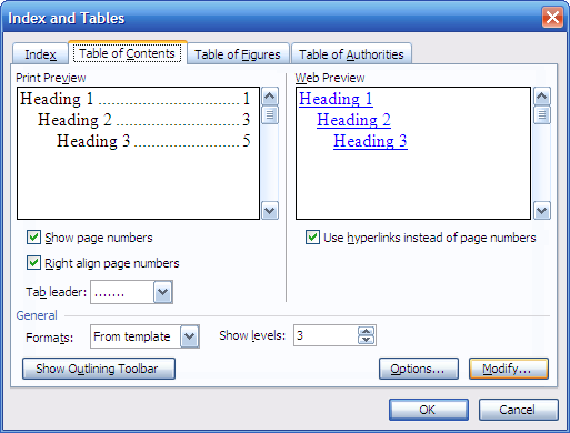 Once you’ve written the entire manual or report, perhaps it’s time to insert the table of contents. You can do this by using this combination — “Alt+I+N+D”. This will open up the following window: